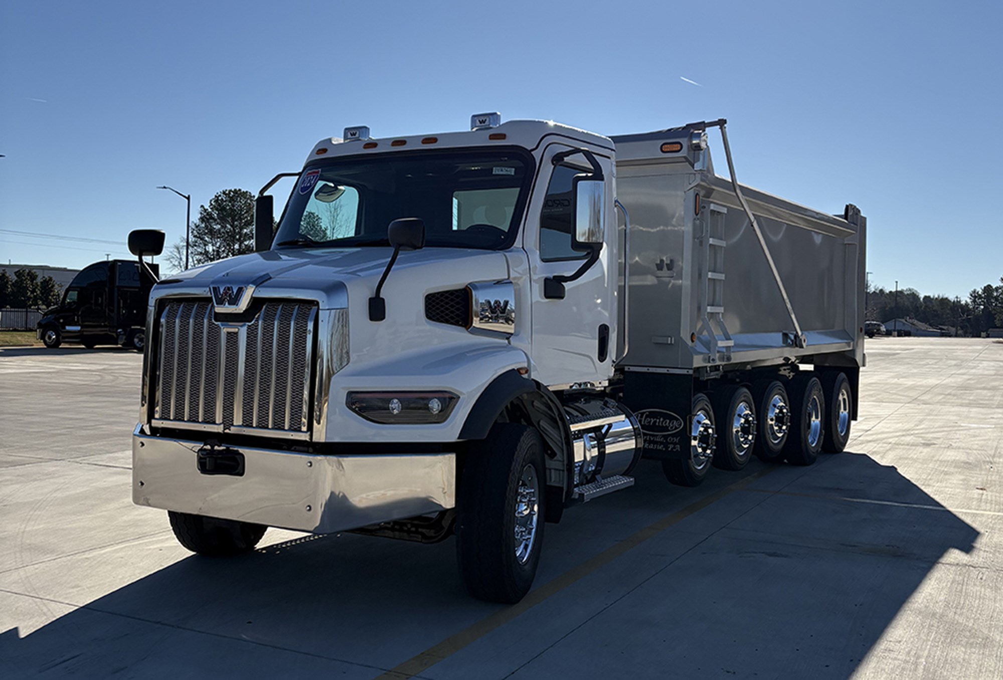 2024 Western Star 47X Quint Axle 21′ Heritage Dump Cummins X12 475 HP Allison 4500RDS Automatic Transmission 18000# Front 46000# Rear (3) 8000# Lift Axles 86700# GVWR P/S A/C Power Windows Mirrors and Locks Heated Mirrors Cruise 64″ Sides Electric Tarp Hi Lift Gate Asphalt Taper Interaxle and Diff Lock 80 Gallon Aluminum Tank.